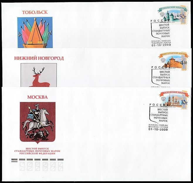 12 КПД. Шестой выпуск стандартных почтовых марок РФ. Города. Архитектура, 01.10.2009 год, Астрахань, Зарайск, Коломна, Ростов, Н. Новгород, В. Новгород, Псков, Москва, Рязань, Тобольск, Тула, Казань