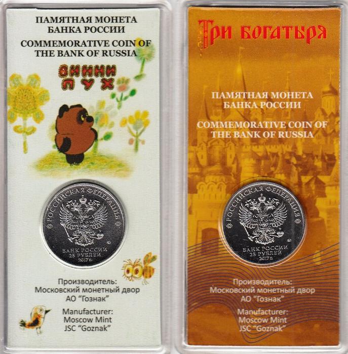25 рублей 2017 год. Набор 2 шт. Российская (советская) мультипликация Винни Пух и Три Богатыря