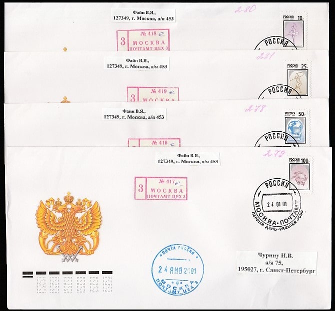 4 КПД. Стандартный выпуск (номинал: 10, 25, 50, 100 рублей), 24.01.2001 год, Москва, почтамт, заказное, прошёл почту