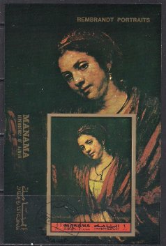 Аджман 1972 год. Портрет Хендрикье Стоффелс, модели и сожительницы Рембрандта. Гашеный блок без зубцов