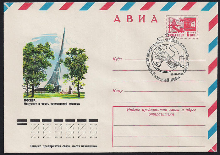 Авиа конверт со СГ 10 лет первого выхода человека в космос. Звездный городок. Гашение 18.3.1975 г. ( 1Ю)