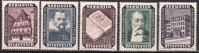 Австрия 1953 год. Реконструкция протестантской школы в Вене. 5 марок с наклейкой 13м