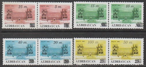 Азербайджан 1994 год. Стандарт. НДП на марках стандартного выпуска 1993 года, 4 пары марок.