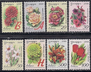 Беларусь 2008 год. Виды садовых цветов. Тёмный фон. 8 марок