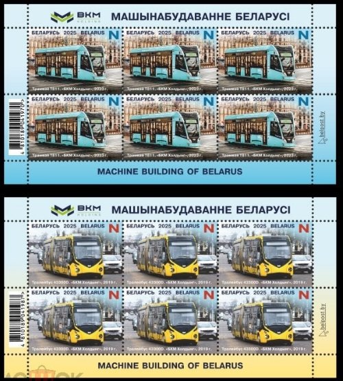 Беларусь 2025 год. Машиностроение Беларуси. Трамвай Т811.Троллейбус 43300D (BY1397). 2 малых листа