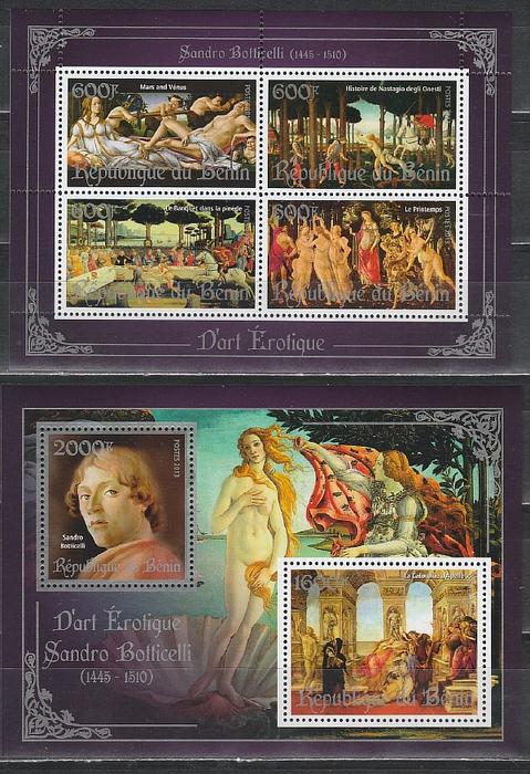 Бенин 2013 год. Эротическая живопись. Сандро Боттичелли. Малый лист + блок. итальянский живописец эпохи ВозрожденияСувенирный выпуск