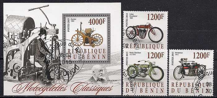 Бенин 2015 год. Мотоциклы. 3 гашеные марки + блок