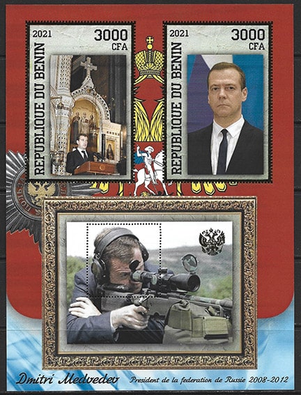 Бенин 2021 год. Дмитрий Медведев, стрельба, малый лист, тиснение золотом