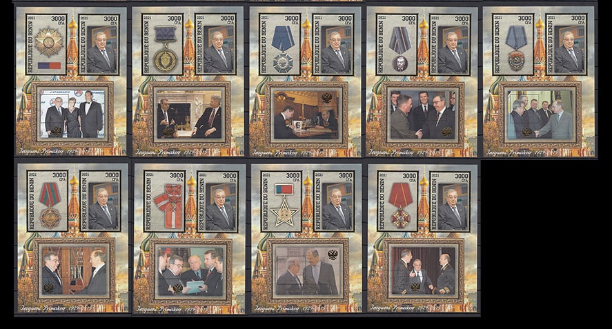 Бенин 2021 год. Евгений Примаков, золотая рамка, 10 б/з блоков, 14 малых листов