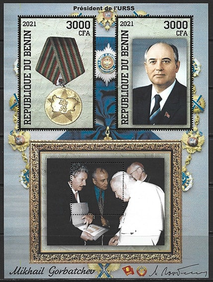 Бенин 2021 год. Михаил Горбачев в Ватикане с Иоанном. Малый лист, тиснение золотом