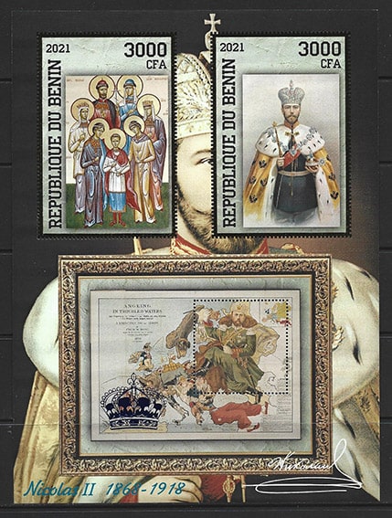 Бенин 2021 год. Николай II, малый лист, тиснение золотом