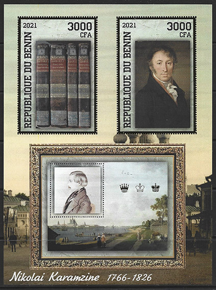 Бенин 2021 год. Николай Карамзин. Картины. Живопись. Блок, тиснение золотом