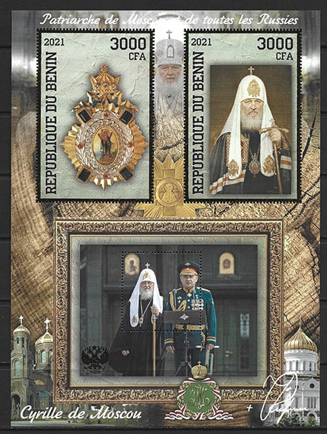 Бенин 2021 год. Патриарх Кирилл и Сергей Шойгу, малый лист, тиснение золотом