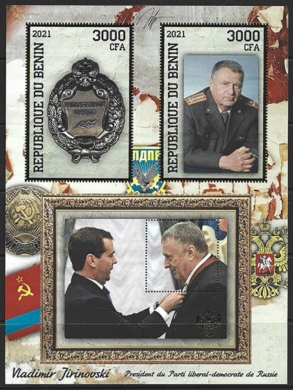 Бенин 2021 год. Владимир Жириновский и Дмитрий Медведев, малый лист, тиснение золотом