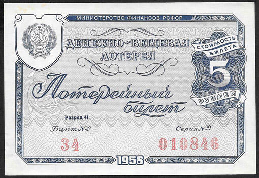 Билет денежно-вещевой лотереи. 5 рублей, 1958 г.