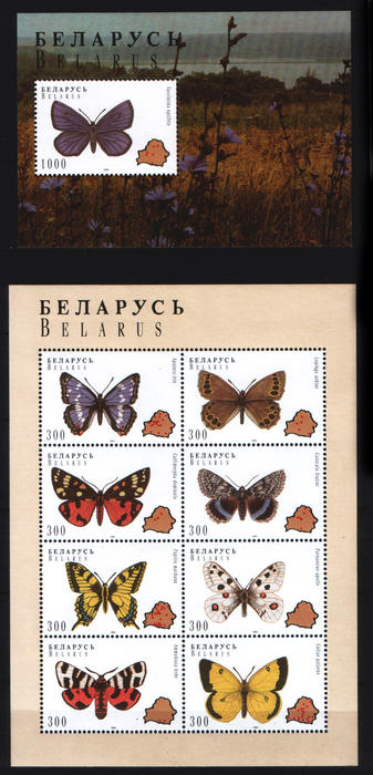 Блок и малый лист марок. Беларусь 1996 год. Бабочки.