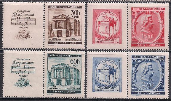 Богемия и Моравия (Рейх) 1941 год. 150 лет со дня смерти Моцарта. 4 марки + купоны (купоны слева)