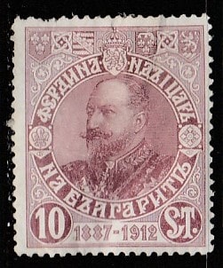 Болгария 1912 год. 25 лет правлению Фердинанда I, ном. 10 St, 1 марка из трёх (наклейка)