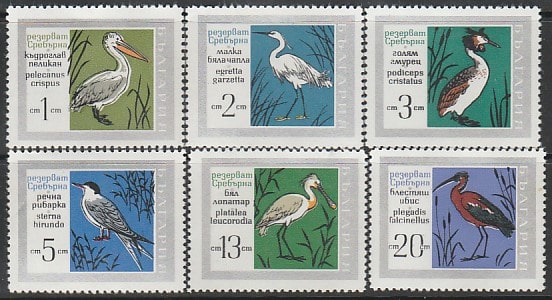 Болгария 1968 год. Природный заповедник Сребырна. Птицы, 6 марок (наклейка)