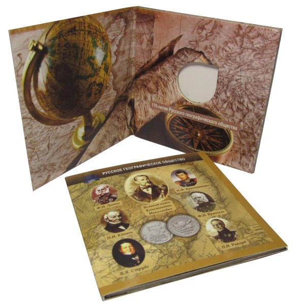 Буклет под монету 5 рублей 2015 г., посвящённой 170-летию Русского географического общества, 84*84 мм