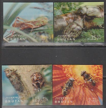 Бутан 1969 год. Насекомые, 4 марки из серии с рифлёным пластиковым покрытием (б/авиа) (7) (4 из 8)