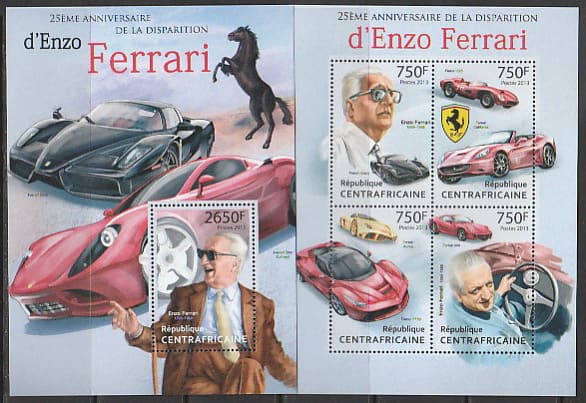 ЦАР 2013 год. 25 лет со дня смерти Энцо Феррари, малый лист + блок.
