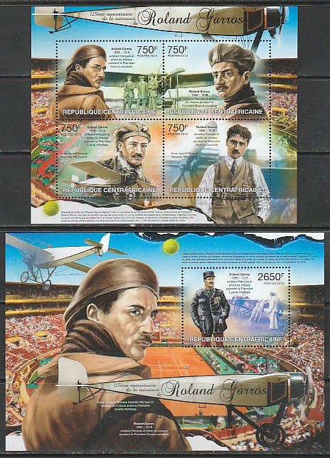 ЦАР 2013 год. Французский лётчик Первой мировой войны Ролан Гаррос, малый лист + блок.