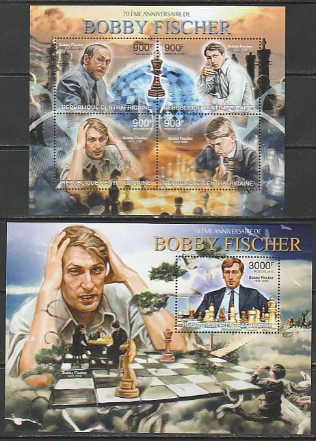 ЦАР 2013 год. Шахматы. 70 лет со дня рождения гроссмейстера Бобби Фишера, малый лист + блок.