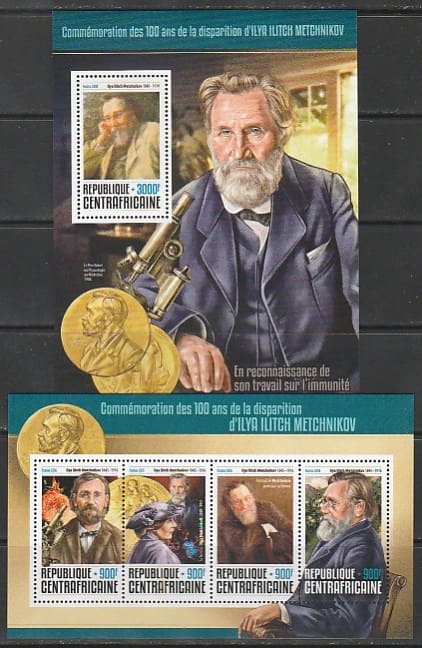 ЦАР 2016 год. 100 лет со дня смерти биолога И.И. Мечникова, малый лист + блок.