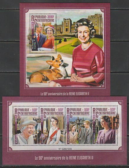 ЦАР 2016 год. 90 лет со дня рождения королевы Елизаветы II, малый лист + блок.