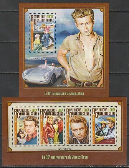 ЦАР 2016 год. Американский актёр Джеймс Дин, малый лист + блок.