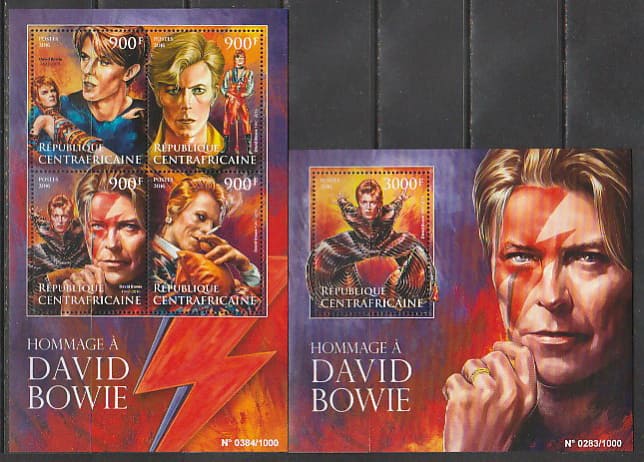 ЦАР 2016 год. Британский рок-музыкант Дэвид Боуи, малый лист + блок.
