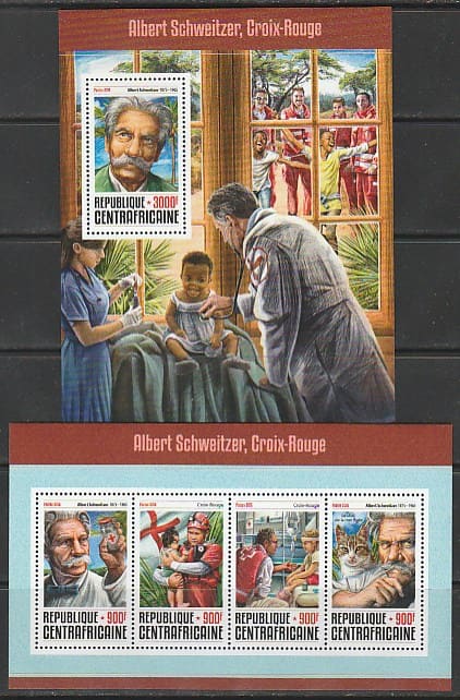 ЦАР 2016 год. Врач Альберт Швейцер. Красный Крест, малый лист + блок.