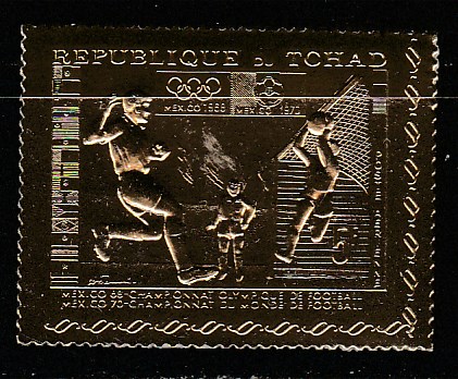Чад 1970 год. Олимпийский футбольный турнир и Чемпионат мира по футболу в Мехико. Тиснение на "золотой" фольге, 1 марка.