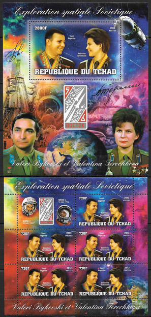 Чад 2013 г. Космос, Восток. Ю. Гагарин и В. Терешкова, блок и малый лист