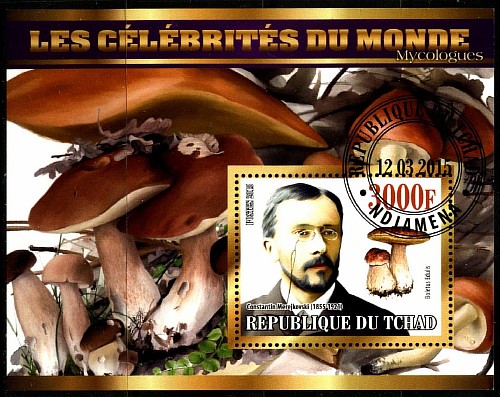 Чад 2015 год. Грибы. Миколог К. Мержковский. Гашеный блок Сувенирный выпуск