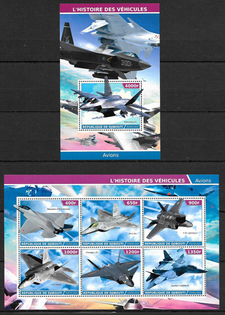 Джибути 2015 г. История транспортных средств, авиация, блок и малый лист