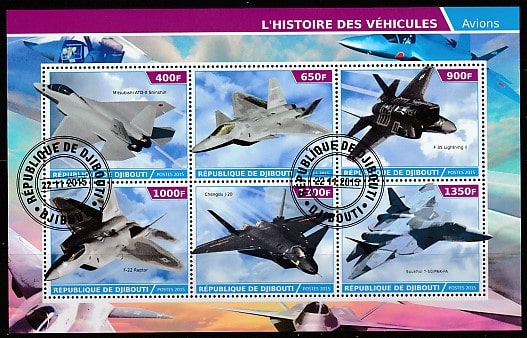 Джибути 2015 год. Современные военные самолёты, гашёный малый лист (сувенирный выпуск)