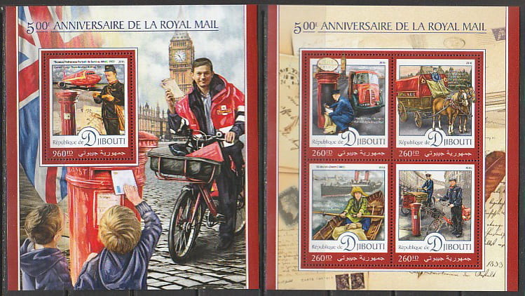 Джибути 2016 год. 500 лет Королевской почте Великобритании, малый лист + блок.