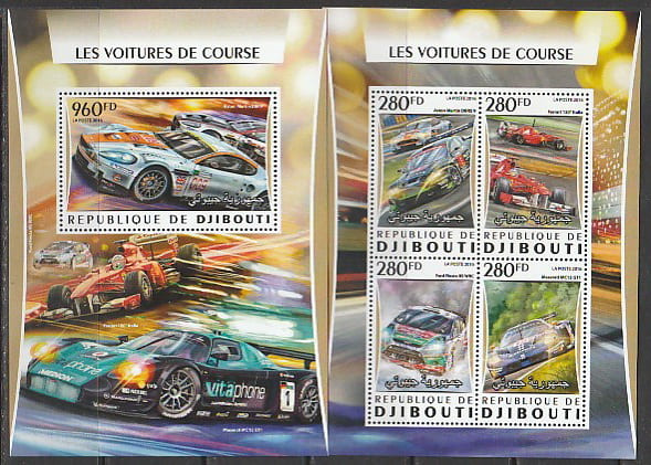 Джибути 2016 год. Гоночные автомобили, малый лист + блок.