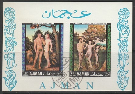 Эмират Аджман 1968 год. Адам и Ева в живописи, б/зубц. блок (гашеный)