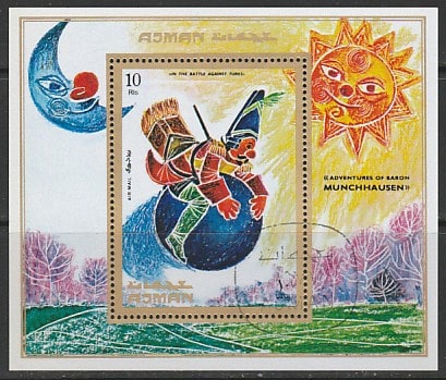 Эмират Аджман 1971 год. Приключения Мюнхгаузена. Верхом на пушечном ядре, блок (гашёный)