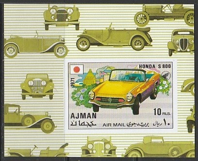 Эмират Аджман 1971 год. Спортивные авто разных стран. Японская "Хонда S 800", б/зубц. блок.