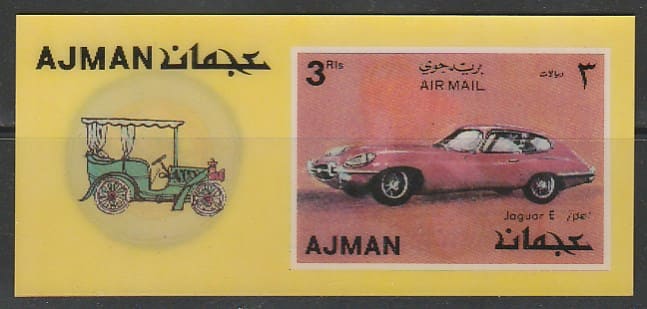 Эмират Аджман 1972 год. Старые и современные автомобили, блок (стерео, с рифлёным пластиковым покрытием) (20)