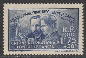 Франция 1938 год. 40 лет открытию радия. Пьер и Мария Жолио-Кюри, 1 марка (наклейка)