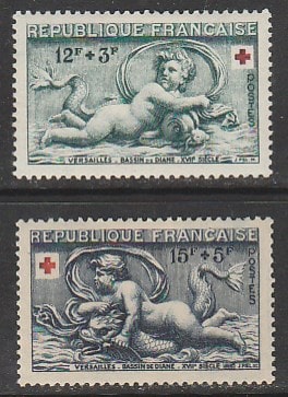Франция 1952 год. Красный Крест. Скульптуры Версальского дворца, 2 марки (наклейка)