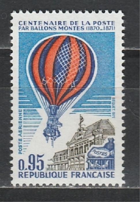 Франция 1971 год. 100 лет балонной почте. Воздушный шар над станцией в Париже. 1 марка