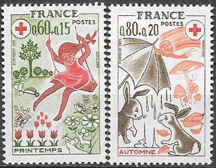 Франция 1975 год. Красный крест. Осень и весна. Девочка и кролики. 2 марки