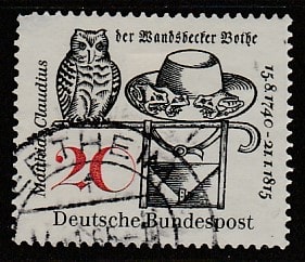ФРГ 1965 год. Поэт Клаудиус Маттиас. Сова, шляпа и трость, 1 марка (гашёная)