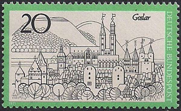 ФРГ 1971 год. Город Гослар. Площадь Кайзера и Гарцкие горы. 1 марка